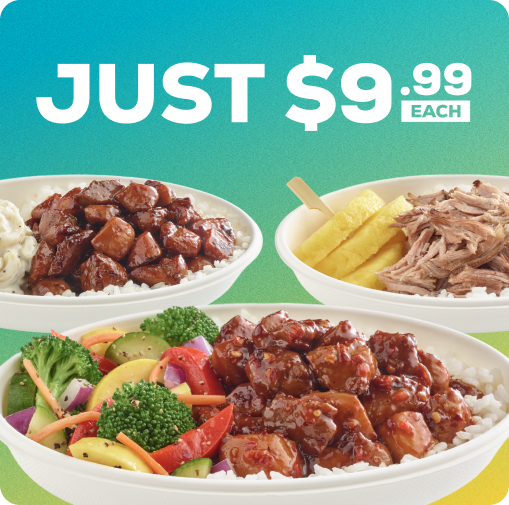 Want our signature teriyaki Huli Huli Chicken with creamy mac salad? Smoky Luau Pork with fresh pineapple? Or spicy Kilauea Chicken with seasoned veggies? No matter what bowl you build, our island-inspired flavors and ingredients always serve up the perfect bite.